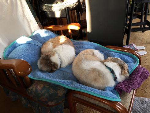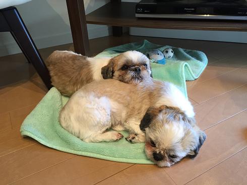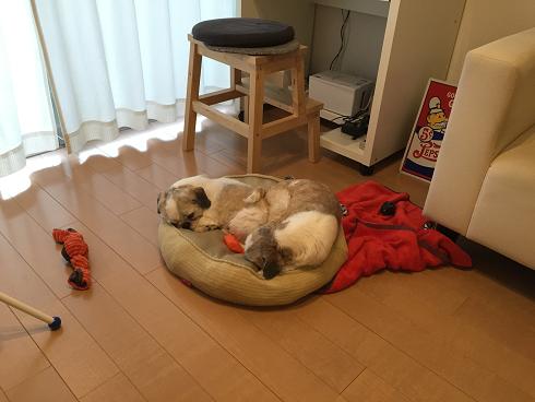 寝ている2号にあごをのせる1号